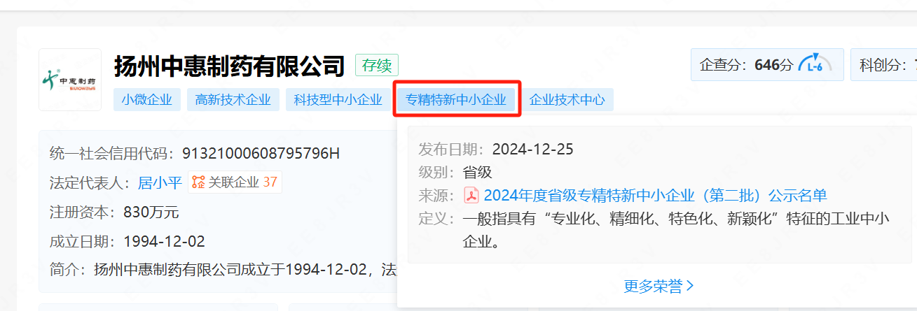 中惠制藥一直秉承質量至上、創(chuàng)新發(fā)展的理念,致力于研發(fā)和生產高品質藥品。公司不僅在技術方面持續(xù)創(chuàng)新,更在管理和服務上精益求精。此次榮獲“專精特新”稱號,標志著中惠制藥在業(yè)界的影響力和競爭力得到了進一步提升。