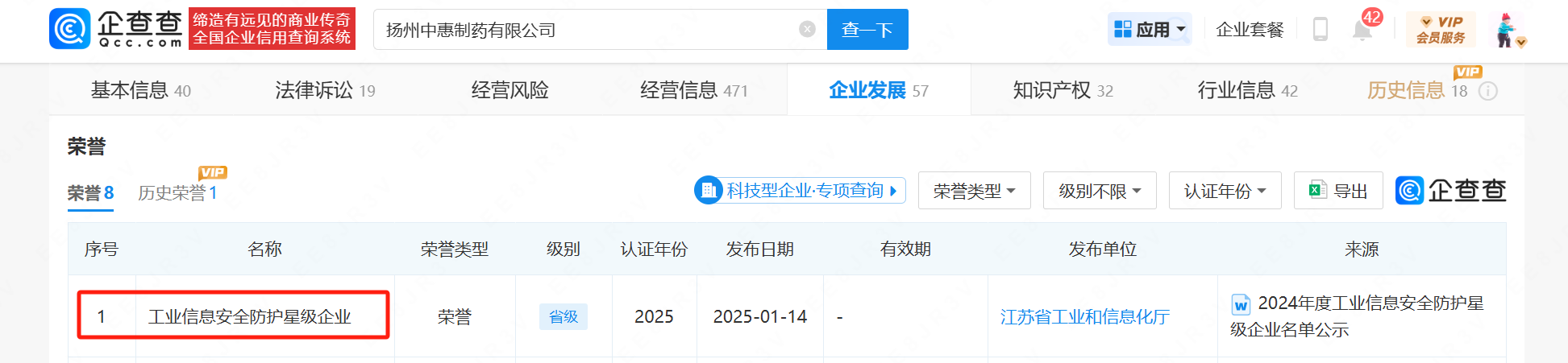 揚州中惠制藥有限公司在信息安全領域再創(chuàng)佳績,近日榮獲“工業(yè)信息安全防護星級企業(yè)”榮譽。這一殊榮是對公司在信息安全管理、技術(shù)防護及風險控制方面持續(xù)努力的高度認可。